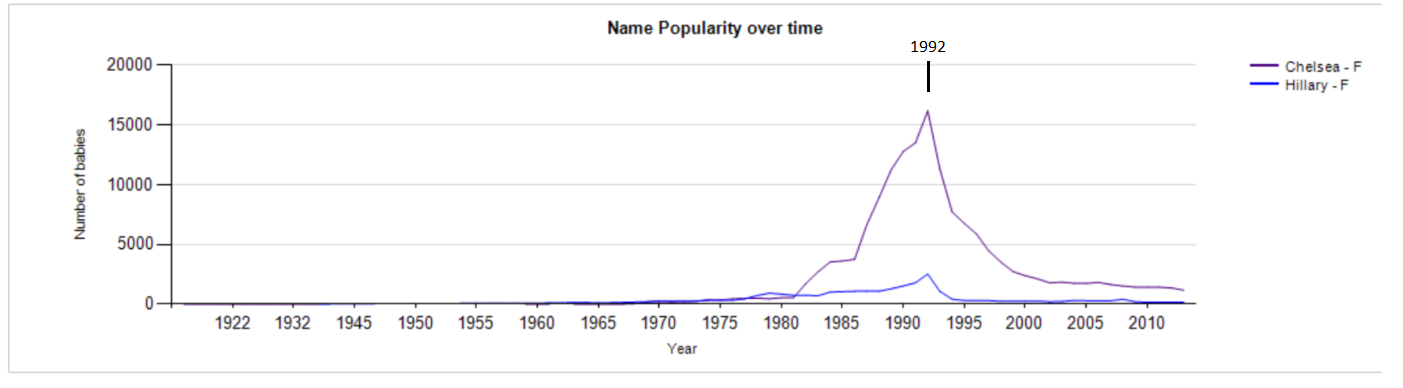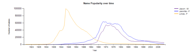 The name Mary was the #1 girls name in the US from 1880 to 1947. Then, it was kicked off its throne by Linda. Linda is in the records starting in 1880 (the earliest year in the SSA records) but exploded in the 1940s. One of the most popular names in US history, Linda outranks all names for the most babies in a single year- in 1947, 99,674 Lindas were born! But unlike Jennifer, which remained at its peak popularity for just over a decade, Linda started plummeting just a couple years after 1947. By 1957, 10 years later and during the peak of the baby boom, “only” 44,000 babies were named Linda. By 1977, less than 3000 and in 2013 there were only 435 Lindas. Linda as a name has mostly German roots but in Spanish it means “beautiful.” In 1946, Buddy Clark released a song called “Linda” that he wrote upon a friend’s request who had a six-year-old daughter named Linda. The song was really popular in 1947 and reached #1 on the Billboard Music charts. The song was then sung and released by another singer, Charlie Spivak, in 1947 and that was also a hit. The Linda the song was named after grew up to become Linda McCartney– Paul’s wife!