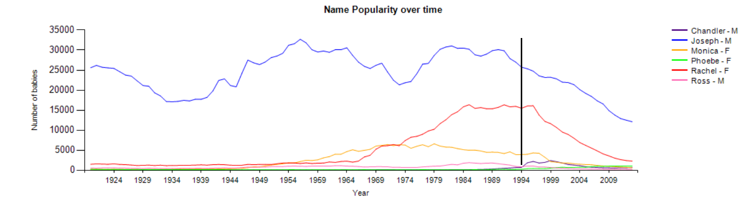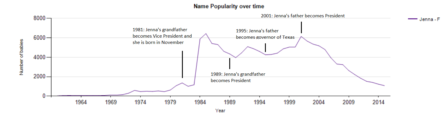 The name Jennifer first appeared in the SSA’s baby name records in 1916 (in order to be released in the public records, it must have been given to at least 5 babies in a given year). The name steadily rose up into the 1960s when it reached 33,000 babies in 1969. Not a bad number. Then in 1970, a novel called A Love Story was released with a character named Jennifer. A movie by the same name was also released soon after. This helped soar Jennifer up to 63,600 names in 1972 (including actress Jennifer Garner)- almost double from 1969. It maintained popularity until the mid 1980s when it started dropping. But I wondered, where did it come from originally and why was it so popular in the 1960s before A Love Story came out? Well, it’s a Welsh name that has been in use since the 18th century, but started being used in the states after George Bernard Shaw’s play called The Doctor’s Dilemma came out in 1906- the main character was named Jennifer and America started falling in love with it.