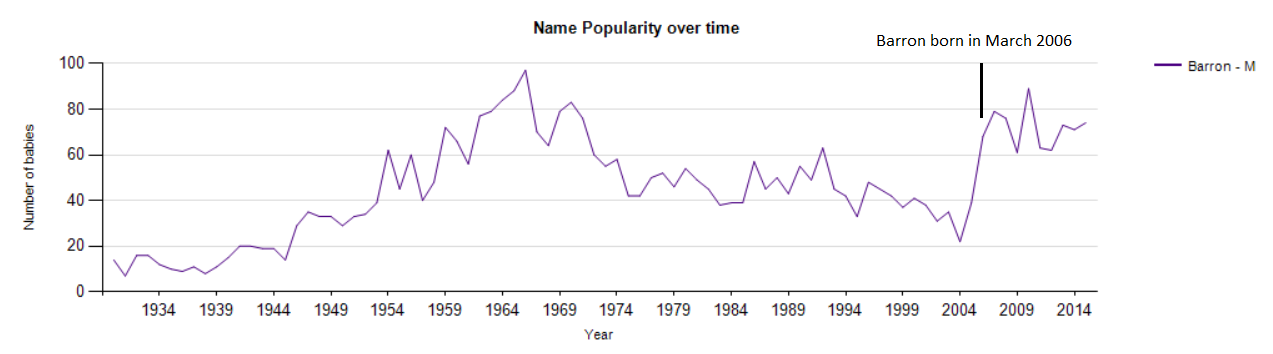 So what will happen to Barron Trump’s name? Only time will tell, but according to the graph below, it was already on the upswing when he was born in 2006. The Apprentice aired for the first time in 2004, so it’s possible Donald’s popularity had an effect on the name. Taking a look at the y-axis, you can see that it has not been a very popular name with less than 100 babies per year (much less than any of the above graphs). My prediction is that it will go slightly up in 2015 and 2016 and then start to go back down.
