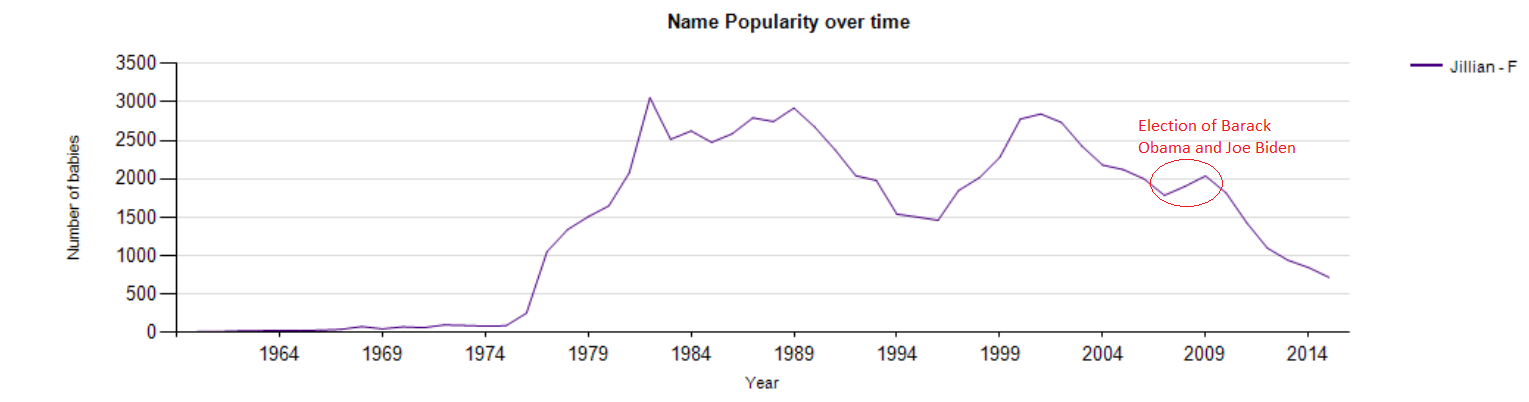I did not see any correlations with the name Michelle and Barack Obama’s Presidency, however thinking of Jill Biden, wife of Joe Biden, I noticed her line was a bit interesting. It’s heading downward but then spikes up in 2008-2009, then starts tumbling back down. I think it’s a definite possiblity it’s related to Jill Biden entering the limelight, but trainer Jillian Michaels of The Biggest Loser could have contributed to this, too, as she was pretty popular during this time. Could Gillian Anderson of The X-Files, despite a different spelling, have contributed to the rise in the mid to late 1990s?
