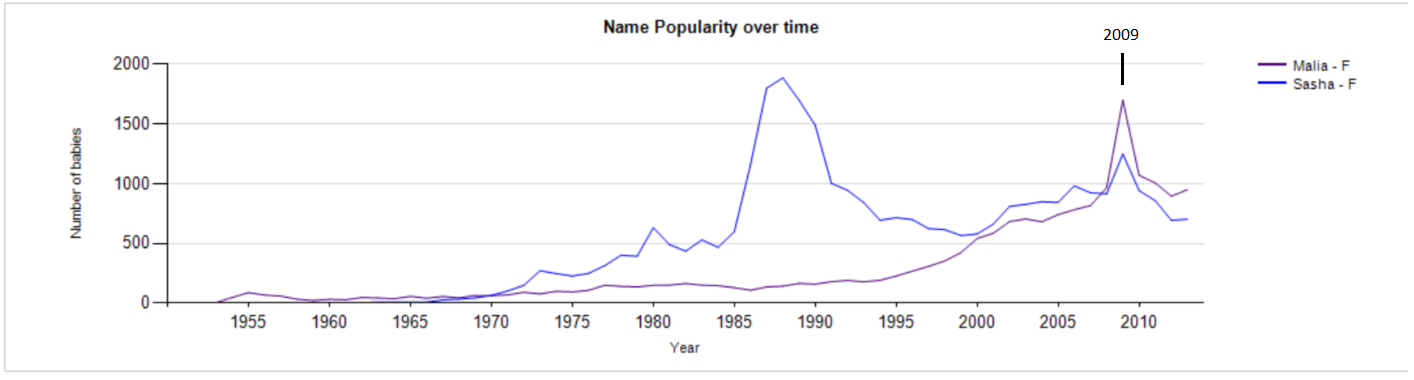 Malia and Sasha Obama’s first names saw a spike in popularity following the 2008 election. The two girls were adorable as millions watched them during the inauguration in 2009 and not surprisingly, lots of people named their girls Malia and Sasha in 2009. But when the fuss died down, so did the names. I’m actually surprised Malia didn’t shoot up more, but maybe some people were worried about it increasing in popularity too much (plus there are many spelling varieties of Malia).